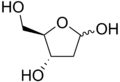 Deoxyribose, or more precisely 2-deoxyribose, is a monosaccharide with idealized formula H−(C=O)−(CH2)−(CHOH)3−H. Its name indicates that it is a deoxy sugar, meaning that it is derived from the sugar ribose by loss of a hydroxy group. Discovered in 1929 by Phoebus Levene,[4] deoxyribose is most notable for its presence in DNA. Since the pentose sugars arabinose and ribose only differ by the stereochemistry at C2′, 2-deoxyribose and 2-deoxyarabinose are equivalent, although the latter term is rarely used because ribose, not arabinose, is the precursor to deoxyribose.