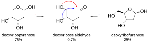 In aqueous solution, deoxyribose primarily exists as a mixture of three structures: the linear form H−(C=O)−(CH2)−(CHOH)3−H and two ring forms, deoxyribofuranose ("C3′-endo"), with a five-membered ring, and deoxyribopyranose ("C2′-endo"), with a six-membered ring. The latter form is predominant (whereas the C3′-endo form is favored for ribose).