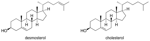 Desmosterol (cholesta-5,24-dien-3β-ol) is a lipid present in the membrane of phytoplankton and an intermediate product in cholesterol synthesis in mammal cells.[1] Structurally, desmosterol has a similar backbone to cholesterol, with the exception of an additional double bond in the structure of desmosterol.