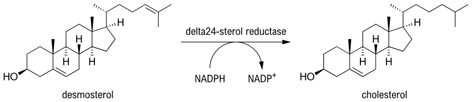 The similarity can be seen biologically through the synthesis of cholesterol in the human body, as desmosterol is the immediate precursor to cholesterol in the Bloch pathway.[2] Desmosterol is accumulated in desmosterolosis and undergoes reduction with the enzyme 24-dehydrocholesterol reductase to form cholesterol.[3]