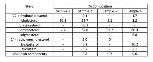 Sterol composition of dulse samples from Grand Manan Island, New York, with data taken from Idler's 1968 paper.[10]