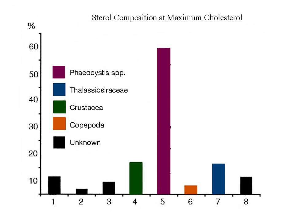 Desmosterol has been used as a biomarker for the presence of copepods. The phytoplankton bloom of P. pouchetii and Thalassiosira decipiens resulted in low amounts of desmosterol at maximum chlorophyll levels, indicating the low abundance and efficient removal of copepods in these phytoplankton.[19]
