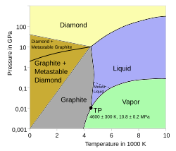 The equilibrium pressure and temperature conditions for a transition between graphite and diamond are well established theoretically and experimentally. The equilibrium pressure varies linearly with temperature, between 1.7 GPa at 0 K and 12 GPa at 5000 K (the diamond/graphite/liquid triple point).[19][20] However, the phases have a wide region about this line where they can coexist. At standard temperature and pressure, 20 °C (293 K) and 1 standard atmosphere (0.10 MPa), the stable phase of carbon is graphite, but diamond is metastable, with a significant kinetic energy barrier that the atoms must overcome to reach the lower energy state,[21] and its rate of conversion to graphite is negligible, with a timescale of millions to billions of years.[16][21] However, at temperatures above about 4500 K, diamond rapidly converts to graphite. Experiments have found that diamond, in the presence of H2O passes through an intermediate linear carbon phase.[22]
