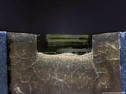 Somewhat related to hardness is another mechanical property toughness, which is a material's ability to resist breakage from forceful impact. The toughness of natural diamond has been measured as 50–65 MPa·m1/2.[42][43] This value is good compared to other ceramic materials, but poor compared to most engineering materials such as engineering alloys, which typically exhibit toughness over 80 MPa·m1/2. As with any material, the macroscopic geometry of a diamond contributes to its resistance to breakage. Diamond has a cleavage plane and is therefore more fragile in some orientations than others. Diamond cutters use this attribute to cleave some stones before faceting them.[44] "Impact toughness" is one of the main indexes to measure the quality of synthetic industrial diamonds.