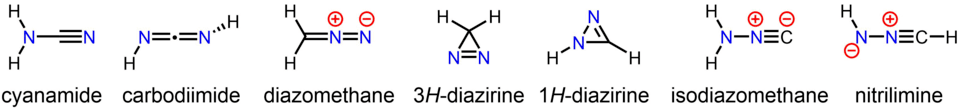 The stable compound cyanamide, whose minor tautomer is carbodiimide, is an isomer of diazomethane. Less stable but still isolable isomers of diazomethane include the cyclic 3H-diazirine and isocyanoamine (isodiazomethane).[30][31] In addition, the parent nitrilimine has been observed under matrix isolation conditions.[32]
