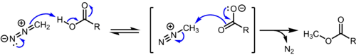 For safety and convenience diazomethane is always prepared as needed as a solution in ether and used as such. It converts carboxylic acids to methyl esters and phenols into their methyl ethers. The reaction is thought to proceed via proton transfer from carboxylic acid to diazomethane to give a methyldiazonium cation, which reacts with the carboxylate ion to give the methyl ester and nitrogen gas. Labeling studies indicate that the initial proton transfer is faster than the methyl transfer step.[6] Since proton transfer is required for the reaction to proceed, this reaction is selective for the more acidic carboxylic acids (pKa ~ 5) and phenols (pKa ~ 10) over aliphatic alcohols (pKa ~ 15).[7]
