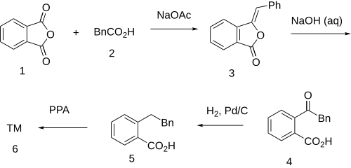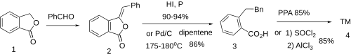 The aldol reaction between phthalide [87-41-2] (1) and benzaldehyde gave benzalphthalide [575-61-1] (2). This was then reduced with hydroiodic acid and red phosphorus to give 2-bibenzylcarboxylic acid [4890-85-1] (3). Alternatively, a catalytic hydrogenation can be performed using dipentene as the source of hydrogen. Although this is a slightly lower yielding method, it does not have the limitations of using hydroiodic acid, which is a safety hazard on a large scale. The ring closure with polyphosphoric acid gave dibenzosuberone (4) in good yield, although Friedel–Crafts reaction is an alternative method.