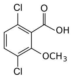 Dicamba (3,6-dichloro-2-methoxybenzoic acid) is a selective systemic herbicide first registered in 1967.[4] Brand names for formulations of this herbicide include Dianat, Banvel, Diablo, Oracle and Vanquish. This chemical compound is a chlorinated derivative of o-anisic acid.[5]