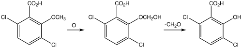 It is biodegraded by both aerobic and anaerobic bacteria to 3,6-dichlorosalicylic acid. This conversion is catalyzed by a dicamba monooxygenase, which hydroxylates the methyl group of dicamba. The hydroxymethylated derivative hydrolyzes readily to an inactive dichlorosalicylic acid or its conjugate base. Modification of the gene encoding this enzyme is one strategy toward dicamba-resistant crops.[33] The dichlorosalicylic acid is far less toxic than dicamba, which is already rather low.[34][35]