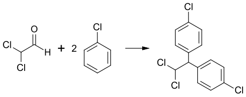 Dichloroacetaldehyde is used to produce other chemical compounds such as mitotane.[3] Condensation with chlorobenzene yields p,p′-dichloro-1,1-diphenyl-2,2-dichloroethane, which was previously used as an insecticide:[1]