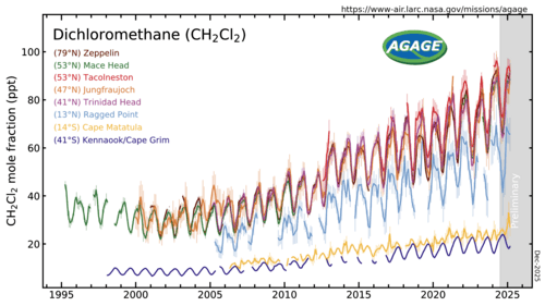 Dichloromethane is not classified as an ozone-depleting substance by the Montreal Protocol.[43] The US Clean Air Act does not regulate dichloromethane as an ozone depleter.[44] Dichloromethane has been classified as a very short-lived substance (VSLS). Despite their short atmospheric lifetimes of less than 0.5 year, VSLSs can contribute to stratospheric ozone depletion, particularly if emitted in regions where rapid transport to the stratosphere occurs.[45] Atmospheric abundances of dichloromethane have been increasing in recent years.