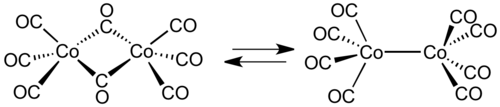 The major isomer (on the left in the above equilibrium process) contains two bridging carbonyl ligands linking the cobalt centres and six terminal carbonyl ligands, three on each metal.[5] It can be summarised by the formula (CO)3Co(μ-CO)2Co(CO)3 and has C2v symmetry. This structure resembles diiron nonacarbonyl (Fe2(CO)9) but with one fewer bridging carbonyl. The Co–Co distance is 2.52 Å, and the Co–COterminal and Co–CObridge distances are 1.80 and 1.90 Å, respectively.[8] Analysis of the bonding suggests the absence of a direct cobalt–cobalt bond.[9]