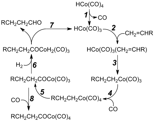 Catalytic cycle for the hydroformylation of a terminal alkene (RCH=CH2) to an aldehyde (RCH2CH2CHO):[4]