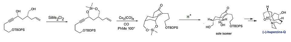 Intramolecular Pauson–Khand reactions, where the starting material contains both the alkene and alkyne moieties, are possible. In the asymmetric synthesis of the Lycopodium alkaloid huperzine-Q, Takayama and co-workers used an intramolecular Pauson–Khand reaction to cyclise an enyne containing a tert-butyldiphenylsilyl (TBDPS) protected primary alcohol.[17] The preparation of the cyclic siloxane moiety immediately prior to the introduction of the dicobalt octacarbonyl ensures that the product is formed with the desired conformation.[18]