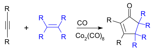 The Pauson–Khand reaction,[13] in which an alkyne, an alkene, and carbon monoxide cyclize to give a cyclopentenone, can be catalyzed by Co2(CO)8,[3][14] though newer methods that are more efficient have since been developed:[15][16]