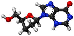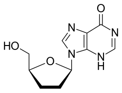 Didanosine (ddI) is a nucleoside analogue of adenosine.[9] It differs from other nucleoside analogues, because it does not have any of the regular bases, instead it has hypoxanthine attached to the sugar ring. Within the cell, ddI is phosphorylated to the active metabolite of dideoxyadenosine triphosphate, ddATP, by cellular enzymes. Like other anti-HIV nucleoside analogs, it acts as a chain terminator by incorporation and inhibits viral reverse transcriptase by competing with natural dATP.