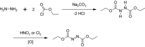 Although available commercially, diethyl azodicarboxylate can be prepared fresh in the laboratory, especially if required in pure, non-diluted form. A two-step synthesis starts from hydrazine, first by alkylation with ethyl chloroformate, followed by treating the resulting diethyl hydrazodicarboxylate with chlorine (bubbling through the solution), hypochlorous acid, concentrated nitric acid or red fuming nitric acid. The reaction is carried out in an ice bath, and the reagents are added dropwise so that the temperature does not rise above 20 °C. Diethyl hydrazodicarboxylate is a solid with melting temperature of 131–133 °C which is collected as a residue; it is significantly more stable to heating than DEAD and is conventionally dried at a temperature of about 80 °C.[4][13]