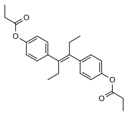 Diethylstilbestrol dipropionate (DESDP) (brand names Agostilben, Biokeral, Clinestrol, Cyclen, Estilbin, Estril, Neobenzoestrol, Orestol, Oroestrol, Ostregenin, Prostilbene, Stilbestriol DP, Stilboestrolum Dipropionicum, Stilboestrol, Synestrin, Willestrol, others), or diethylstilbestrol dipropanoate, also known as stilboestrol dipropionate (BANM), is a synthetic nonsteroidal estrogen of the stilbestrol group that was formerly marketed widely throughout Europe.[1][2] It is an ester of diethylstilbestrol with propionic acid,[1] and is more slowly absorbed in the body than diethylstilbestrol.[3] The medication has been said to be one of the most potent estrogens known.[4]