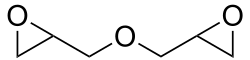 Diglycidyl ethers are chemical compounds used as a reactive diluents for epoxy resin. Other uses include treating textiles and stabilizing chlorinated organic compounds. Diglycidyl ether itself is extremely toxic, and can prove fatal or cause permanent damage if inhaled or consumed orally. As a class of compounds, there are a number of them available commercially with much lower toxicity profiles.[3][4] One such example is epoxy resin itself Bisphenol A diglycidyl ether.