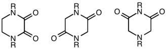 A diketopiperazine (DKP), also known as a dioxopiperazine or piperazinedione, is a class of organic compounds related to piperazine but containing two amide linkages. DKP's are the smallest known class of cyclic peptide.[1] Despite their name, they are not ketones, but amides. Three regioisomers are possible, differing in the locations of the carbonyl groups.