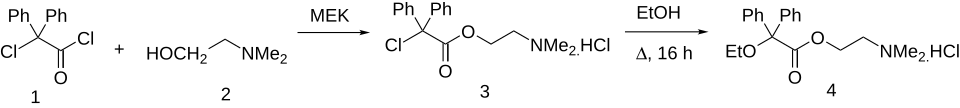 - The reaction between 2-chloro-2,2-diphenylacetyl chloride [2902-98-9] (1) and Deanol [108-01-0] (2) gives [3042-75-9] (3). The intermediate haloalkane is then alkoxylated by refluxing in ethanol, completing the synthesis of Dimenoxadol (4).
