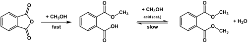 Dimethyl phthalate is manufactured commercially via the esterification of phthalic anhydride with methanol. The reaction can be catalysed by a strong acid, such as sulfuric acid; various lewis acids may be used as an alterative, including complexes of titanium, zirconium or tin. Excess methanol is used to ensure complete conversion, with the remainder removed by distillation at the end.[4][9]
