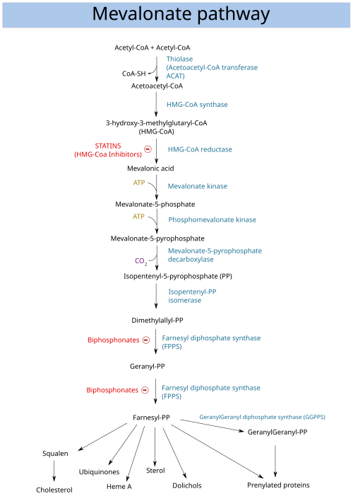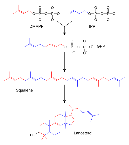 Simplified version of the steroid synthesis pathway with the intermediates isopentenyl pyrophosphate (IPP), dimethylallyl pyrophosphate (DMAPP), geranyl pyrophosphate (GPP) and squalene shown. Some intermediates are omitted.