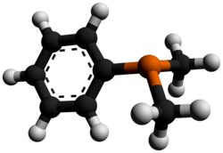 Dimethylphenylphosphine is an organophosphorus compound with a formula P(C6H5)(CH3)2. The phosphorus is connected to a phenyl group and two methyl groups, making it the simplest aromatic alkylphosphine. It is colorless air sensitive liquid. It is a member of series (CH3)3-n(C6H5)2P that also includes n = 0, n = 2, and n = 3 that are often employed as ligands in metal phosphine complexes.
