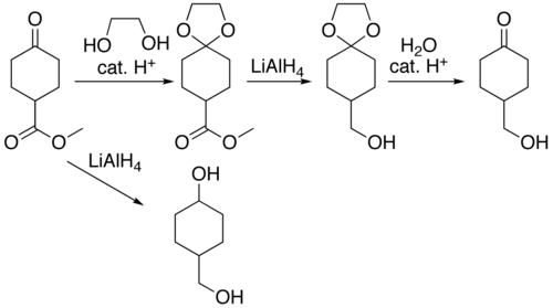 Organic compounds containing carbonyl groups sometimes need protection so that they do not undergo reactions during transformations of other functional groups that may be present. A variety of approaches to protection and deprotection of carbonyls[6] including as dioxolanes[7] are known. For example, consider the compound methyl cyclohexanone-4-carboxylate, where lithium aluminium hydride reduction will produce 4-hydroxymethylcyclohexanol. The ester functional group can be reduced without affecting the ketone by protecting the ketone as a ketal. The ketal is produced by acid catalysed reaction with ethylene glycol, the reduction reaction carried out, and the protecting group removed by hydrolysis to produce 4-hydroxymethylcyclohexanone.