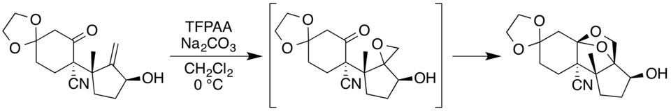 In the case of neosporol, a Prilezhaev reaction[13] with trifluoroperacetic acid is used to convert a suitable allyl alcohol precursor to an epoxide, which then undergoes a ring-expansion reaction with a proximate carbonyl functional group to form the dioxolane ring.[10][11]