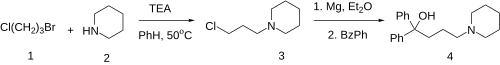 Alkylation of 1-Bromo-3-chloropropane [109-70-6] (1) with piperidine (2) gives 3-Piperidinopropyl chloride [1458-63-5] (3). The Grignard reaction of this intermediate with benzophenone [119-61-9] gives the benzhydrol and hence, Diphenidol (4).