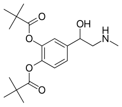 Dipivefrine, also known as epinephrine dipivalate or as 3,4-dipivalyloxy-β-hydroxy-N-methylphenethylamine, is a substituted phenethylamine and catecholamine.[6] It is the 3,4-dipivalate ester of epinephrine (adrenaline).[6]