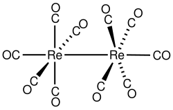 Dirhenium decacarbonyl is the inorganic compound with the chemical formula Re2(CO)10 . Commercially available, it is used as a starting point for the synthesis of many rhenium carbonyl complexes. It was first reported in 1941 by Walter Hieber, who prepared it by reductive carbonylation of rhenium.[2] The compound consists of a pair of square pyramidal Re(CO)5 units joined via a Re-Re bond, which produces a homoleptic carbonyl complex.[3]