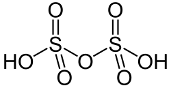 Disulfuric acid (alternative spelling disulphuric acid) or pyrosulfuric acid (alternative spelling pyrosulphuric acid), also named oleum, is a sulfur oxoacid.[3] It is a major constituent of fuming sulfuric acid, oleum, and this is how most chemists encounter it. As confirmed by X-ray crystallography, the molecule consists of a pair of SO2(OH) groups joined by an oxygen atom,[4] giving a molecular formula of H2O7S2.