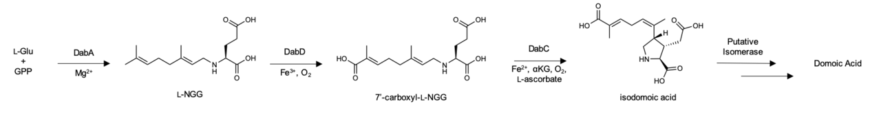 In 2018, using growth conditions known to induce domoic acid production in Pseudo-nitzschia multiseries, transcriptome sequencing successfully identified candidate domoic acid biosynthesis genes responsible for the pyrrolidine core.[11] These domoic acid biosynthesis genes, or 'Dab' enzymes were heterologously expressed, characterized, and annotated as dabA (terpene cyclase), dabB (hypothetical protein), dabC (α-ketoglutarate–dependent dioxygenase), and dabD (CYP450).