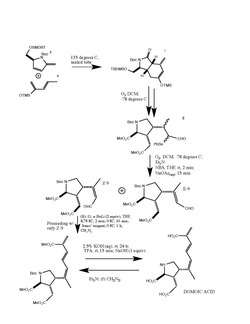 Using intermediates 5 and 6, a Diels-Alder reaction produced a bicyclic compound (7). 7 then underwent ozonolysis to open the six-membered ring leading to selenide (8). 8 was then deselenated to form 9 (E-9 and Z-9), lastly leading to the formation of (-) domoic acid.[1]