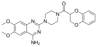Common side effects include dizziness, sleepiness, swelling, nausea, shortness of breath, and abdominal pain.[2] Severe side effects may include low blood pressure with standing, an irregular heart beat, and priapism.[2][3] It is a selective α1-adrenergic blocker in the quinazoline class of compounds.[2]