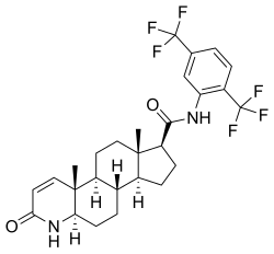 Dutasteride, also known as N-[2,5-bis(trifluoromethyl)phenyl]-3-oxo-4-aza-5α-androst-1-ene-17β-carboxamide, is a synthetic androstane steroid and a 4-azasteroid.[67][68] It is an analogue of finasteride in which the tert-butyl amide moiety has been replaced with a 2,5-bis(trifluoromethyl)phenyl group.[68]