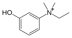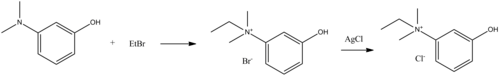 Edrophonium, ethyl-(3-hydroxyphenyl)dimethylammonium chloride, is made by reacting 3-dimethylaminophenol with ethyl bromide, which forms ethyl(3-hydroxyphenyl)dimethylammonium bromide, the bromine atom of which is replaced with a chlorine atom by reacting it with silver chloride, giving edrophonium.[5]