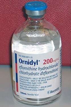 Eflornithine, sold under the brand name Ornidyl among others, is a medication used to treat African trypanosomiasis (sleeping sickness) and excessive hair growth on the face in women.[1][3][4] Specifically it is used for the second stage of sleeping sickness caused by T. b. gambiense and may be used with nifurtimox.[3][5] It is taken intravenously (injection into a vein) or topically.[3][4] It is an ornithine decarboxylase inhibitor.[2]