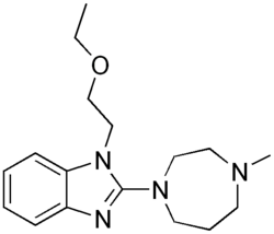 Emedastine (trade name Emadine) is a second generation antihistamine used in eye drops to alleviate the symptoms of allergic conjunctivitis.[1] It acts as a H1 receptor antagonist. It works by blocking the action of histamine that causes allergic symptoms. It is used in form of the difumarate.[2] The emedastine difumarate is a white, crystalline, water-soluble fine powder. Emedastine eye drops is usually applied twice a day to the affected eye. When the patients with allergic conjunctivitis were treated with 0.05% emedastine difumarate ophthalmic solution for six weeks, the signs and symptoms such as redness, itching and swelling of the eyes were relieved. Emedastine appears to be devoid of effects on adrenergic, dopaminergic and serotonin receptors. This drug was developed by Alcon, which is global medical company specializing in eye care products.
