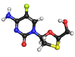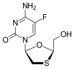 Emtricitabine (commonly called FTC, systematic name 2',3'-dideoxy-5-fluoro-3'-thiacytidine[1]), with trade name Emtriva (formerly Coviracil), is a nucleoside reverse-transcriptase inhibitor (NRTI) for the prevention and treatment of HIV infection in adults and children. In 2019, it was the 494th most commonly prescribed medication in the United States, with more than 3 thousand prescriptions.[2] It is an analog of the nucleoside cytidine.