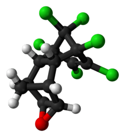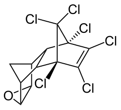 Endrin is an organochlorine compound with the chemical formula C12H8Cl6O that was first produced in 1950 by Shell and Velsicol Chemical Corporation. It was primarily used as an insecticide, as well as a rodenticide and piscicide. It is a colourless, odorless solid, although commercial samples are often off-white. Endrin was manufactured as an emulsifiable solution known commercially as Endrex.[5] The compound became infamous as a persistent organic pollutant, and for this reason it is banned in many countries.[6]