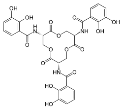 Enterobactin (also known as enterochelin) is a high affinity siderophore that acquires iron for microbial systems. It is primarily found in Gram-negative bacteria, such as Escherichia coli and Salmonella typhimurium.[1]