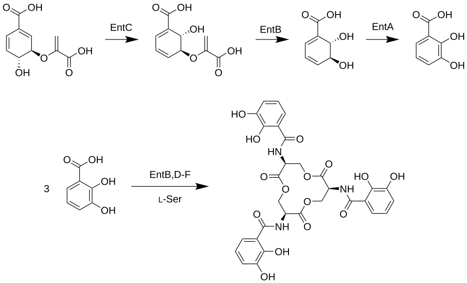 Chorismic acid, an aromatic amino acid precursor, is converted to 2,3-dihydroxybenzoic acid (DHB) by a series of enzymes, EntA, EntB and EntC. An amide linkage of DHB to L-serine is then catalyzed by EntD, EntE, EntF and EntB. Three molecules of the DHB-Ser formed undergo intermolecular cyclization, yielding enterobactin.[4] Although a number of stereoisomers are possible due to the chirality of the serine residues, only the Δ-cis isomer is metabolically active.[3] The first three-dimensional structure of a metal enterobactin complex was determined as the vanadium(IV) complex.[5] Although ferric enterobactin long eluded crystallization, its definitive three-dimensional structure was ultimately obtained using racemic crystallography, in which crystals of a 1:1 mixture of ferric enterobactin and its mirror image (ferric enantioenterobactin) were grown and analyzed by X-ray crystallography.[6]