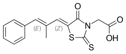 Epalrestat is a carboxylic acid derivative[1] and a noncompetitive and reversible aldose reductase inhibitor used for the treatment of diabetic neuropathy, which is one of the most common long-term complications in patients with diabetes mellitus. It reduces the accumulation of intracellular sorbitol which is believed to be the cause of diabetic neuropathy, retinopathy and nephropathy [2][3] It is well tolerated, with the most commonly reported adverse effects being gastrointestinal issues such as nausea and vomiting, as well as increases in certain liver enzymes.[4] Chemically, epalrestat is unusual in that it is a drug that contains a rhodanine group. Aldose reductase is the key enzyme in the polyol pathway whose enhanced activity is the basis of diabetic neuropathy. Aldose reductase inhibitors (ARI) target this enzyme. Out of the many ARIs developed, ranirestat and fidarestat are in the trial stage. Others have been discarded due to unacceptable adverse effects or weak efficacy. Epalrestat is the only ARI commercially available.[5] It is easily absorbed into the neural tissue[6] and inhibits the enzyme with minimum side effects.[7]