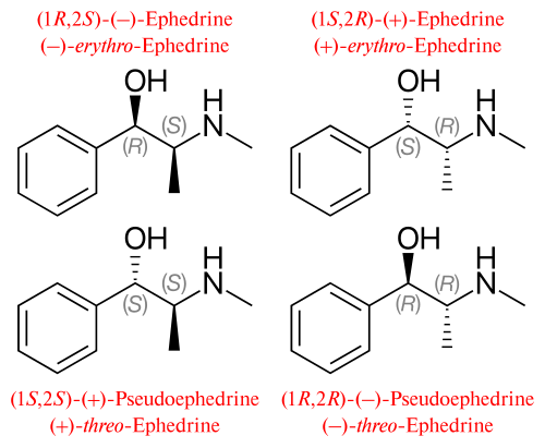 - ^ a b Drew CD, Knight GT, Hughes DT, Bush M (September 1978). "Comparison of the effects of D-(-)-ephedrine and L-(+)-pseudoephedrine on the cardiovascular and respiratory systems in man". British Journal of Clinical Pharmacology. 6 (3): 221–5. doi:10.1111/j.1365-2125.1978.tb04588.x. PMC 1429447. PMID 687500.