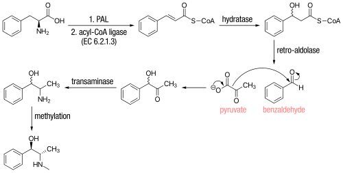 Ephedrine was long thought to come from modifying the amino acid L-phenylalanine.[95] L-Phenylalanine would be decarboxylated and subsequently attacked with ω-aminoacetophenone. Methylation of this product would then produce ephedrine. This pathway has since been disproven.[95] A new pathway proposed suggests that phenylalanine first forms cinnamoyl-CoA via the enzymes phenylalanine ammonia-lyase and acyl CoA ligase.[93] The cinnamoyl-CoA is then reacted with a hydratase to attach the alcohol functional group. The product is then reacted with a retro-aldolase, forming benzaldehyde. Benzaldehyde reacts with pyruvic acid to attach a 2-carbon unit. This product then undergoes transamination and methylation to form ephedrine and its stereoisomer, pseudoephedrine.[94]