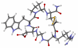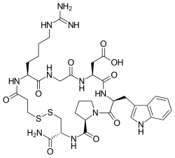 Eptifibatide (Integrilin, Millennium Pharmaceuticals, also co-promoted by Schering-Plough/Essex), is an antiplatelet drug of the glycoprotein IIb/IIIa inhibitor class.[1] Eptifibatide is a cyclic heptapeptide derived from a disintegrin protein (P22827) found in the venom of the southeastern pygmy rattlesnake (Sistrurus miliarius barbouri). It belongs to the class of the arginine-glycine-aspartate-mimetics and reversibly binds to platelets. Eptifibatide has a short half-life. The drug is the third inhibitor of GPIIb/IIIa that has found broad acceptance after the specific antibody abciximab and the non-peptide tirofiban entered the global market.