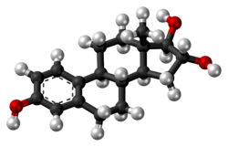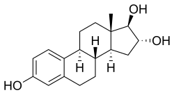 Estriol (E3), also spelled oestriol, is a steroid, a weak estrogen, and a minor female sex hormone.[1][2] It is one of three major endogenous estrogens, the others being estradiol and estrone.[1] Levels of estriol in women who are not pregnant are almost undetectable.[3] However, during pregnancy, estriol is synthesized in very high quantities by the placenta and is the most produced estrogen in the body by far,[3][4] although circulating levels of estriol are similar to those of other estrogens due to a relatively high rate of metabolism and excretion.[4][5] Relative to estradiol, both estriol and estrone have far weaker activity as estrogens.[1]